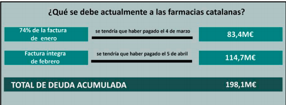 83,4M€ que los farmacéuticos todavía no han cobrado, correspondientes al 74% de la factura de enero (112,7M€) y que se tendrían que haber hecho efectivos el 4 de marzo, se acumula con ellos una deuda que asciende a 198,1M€.