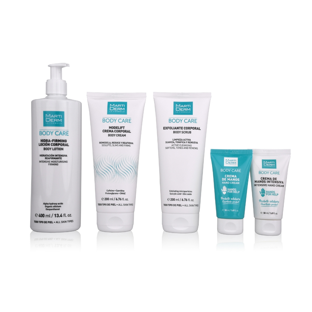 MartiDerm propone tres productos destinados a conseguir una dermis más lisa, uniforme y tonificada y combatir visiblemente los efectos del envejecimiento corporal con una cosmeticidad exquisita que hace que el cuidado diario se convierta además en una experiencia placentera. Además, dos productos destinados al cuidado de manos con precisas fórmulas, una de las zonas que más demanda cuidados de todo el cuerpo, cuyas ventas van íntegramente destinadas a proyectos de colaboración con Cruz Roja.