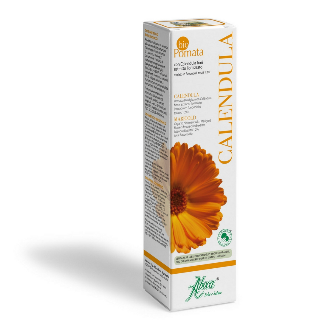 Caléndula BioPomada, de Aboca, es un producto innovador caracterizado por la presencia de extracto liofilizado de flores de caléndula que garantiza una elevada concentración de principios activos y que, en sinergia con el aceite esencial de Hipérico, completa la funcionalidad cosmética de la pomada.
