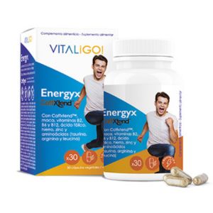 Complemento natural a base de Caffxtend™ (cafeína), maca, vitaminas B2, B6 y B12, ácido fólico, hierro, zinc y aminoácidos (taurina, arginina y leucina) pensado para estimular el sistema nervioso.
