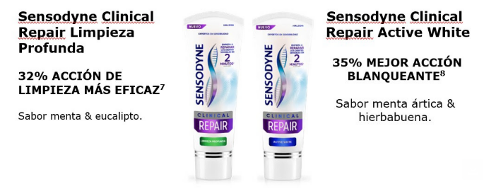 Gracias a nuestra tecnología, la nueva gama de Sensodyne, la marca dedicada al alivio de la sensibilidad dental desde 1961, empieza a reparar las áreas sensibles de los dientes en solo 2 minutos1 desde el primer cepillado formando una capa protectora compuesta en un 96% del mismo material que el esmalte. Por ello, Sensodyne Clinical Repair llega a España de la mano de dos variantes, para un alivio de la sensibilidad clínicamente probadas en 14 días.