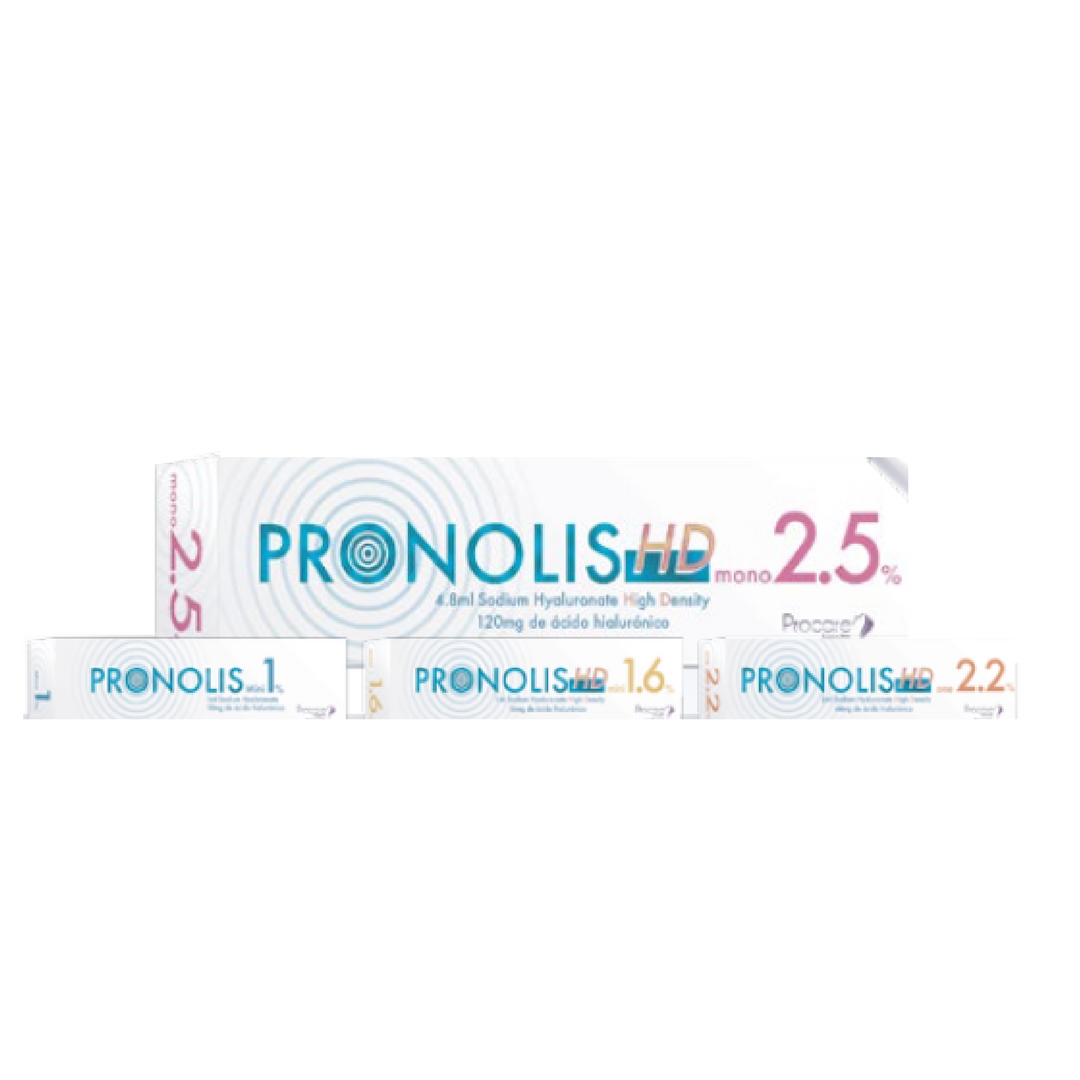 Pronolis HD, con la mayor concentración de AH del mercado, es el único monoshot comercializado y está especialmente diseñado para el tratamiento de la artrosis de rodilla. Se encuentra disponible en una amplia variedad de concentraciones (1%, 1.6%, 2.2% y 2.5%)