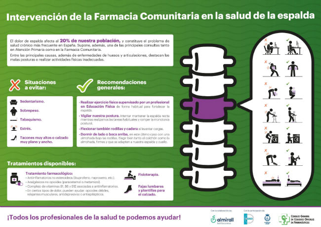 Así, se ha desarrollado una guía de actuación farmacéutica, elaborada por un equipo multidisciplinar de farmacéuticos, médicos, fisioterapeutas y licenciados en Educación Física y Deporte, expertos en dolor de espalda. Y está prevista el próximo día 13 de junio, la realización de una acción formativa para farmacéuticos a través de un webinar que se emitirá en directo a través de los diferentes Colegios Oficiales de Farmacéuticos.
