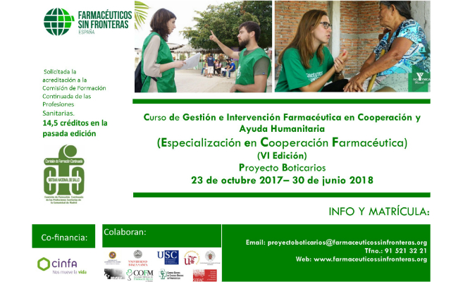El próximo lunes, 23 de octubre dará comienzo el curso de especialización en cooperación farmacéutica. Se trata de una actividad formativa de ocho meses de duración en el que se capacita al profesional de la farmacia tanto en el funcionamiento de los organismos del tercer sector como en la identificación, diseño, ejecución y evaluación de proyectos de carácter sanitario en el ámbito de la cooperación internacional.