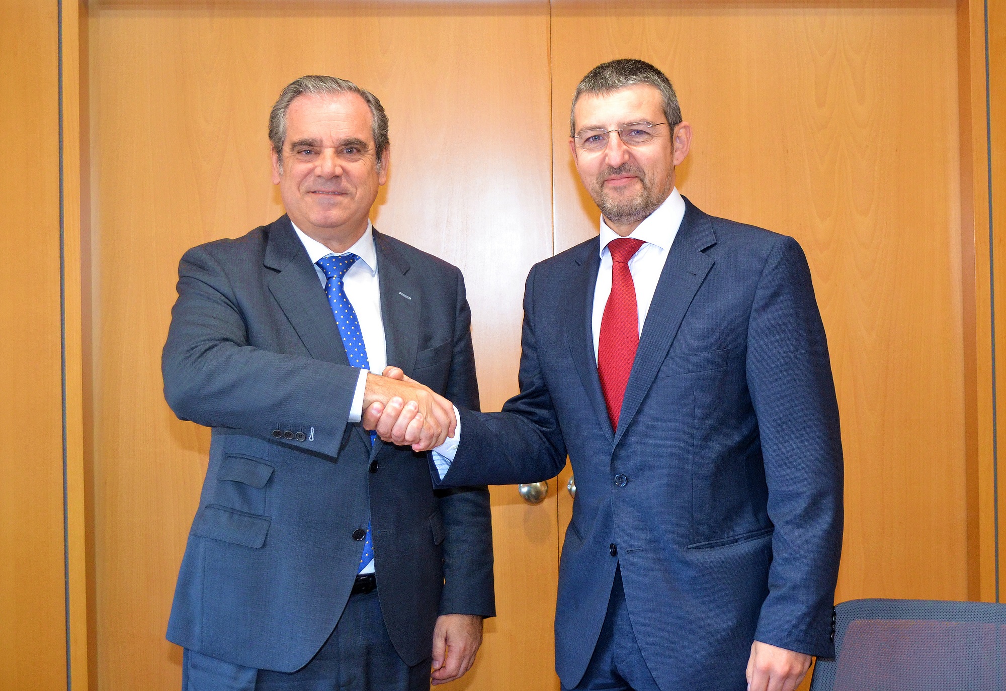 Jesús Aguilar, presidente del Consejo General de Farmacéuticos, y Andoni Lorenzo, presidente de la Federación Española de Diabetes, han firmado el convenio de colaboración