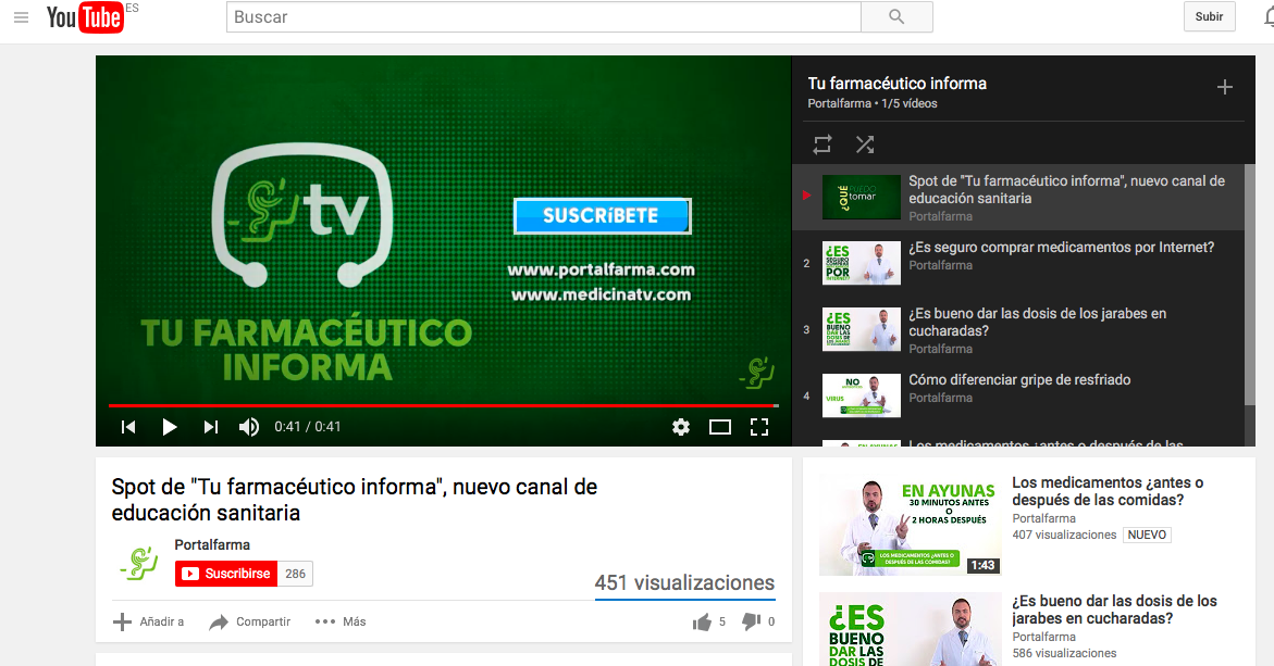 El Consejo General de Colegios Oficiales de Farmacéuticos, en virtud de un convenio de colaboración suscrito con Medicina TV, ha lanzado un nuevo canal de videoconsejos farmacéuticos en YouTube, bajo el nombre “Tu farmacéutico informa”. Se trata de una iniciativa de educación sanitaria, en el que cada semana, se subirá a la plataforma YouTube de Portalfarma un videoconsejo, impartido por profesionales farmacéuticos, sobre el uso responsable de los medicamentos, así como de la importante labor que desempeña la Farmacia como agente sanitario en el ámbito de la Salud Pública.