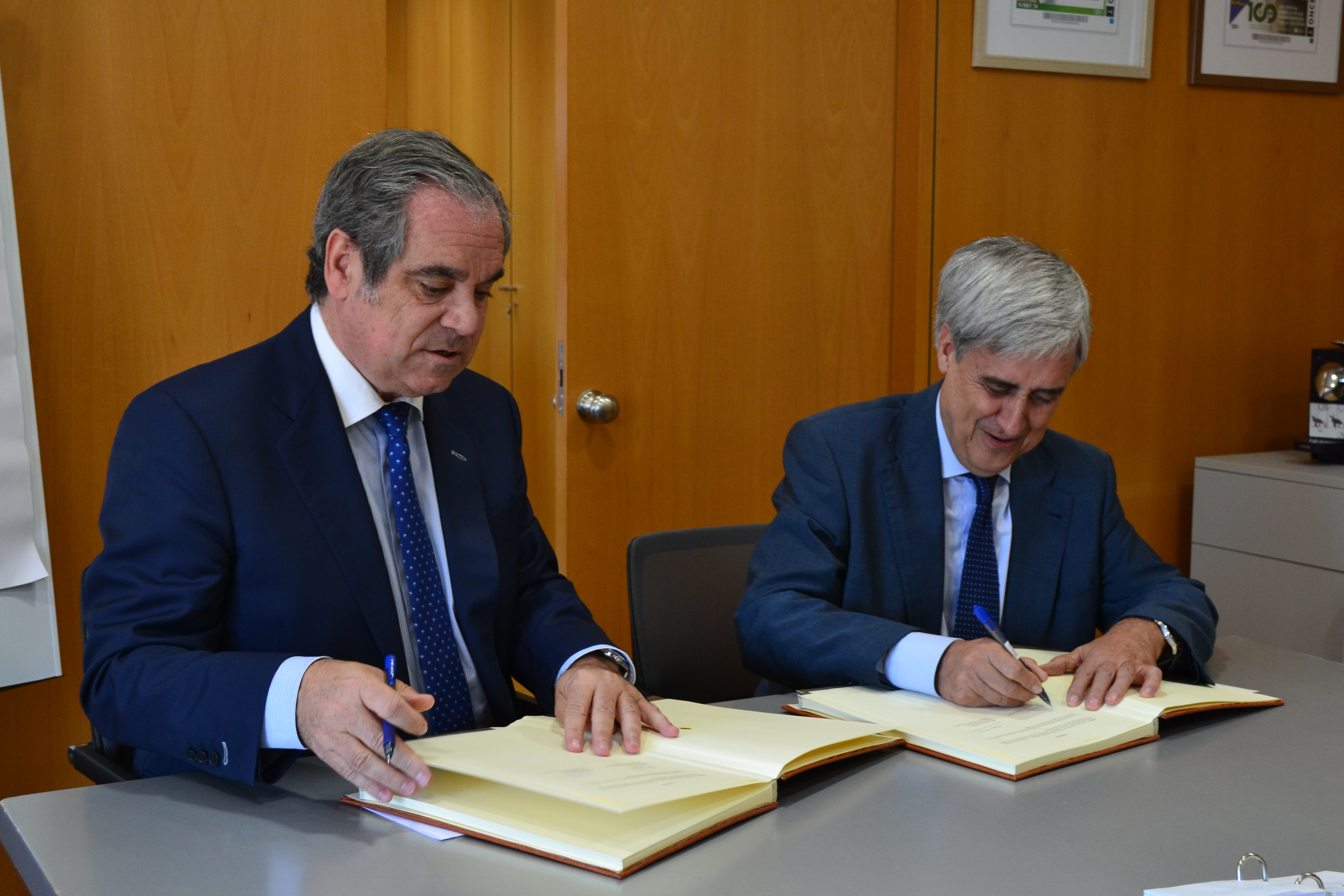 El presidente del Consejo General de Colegios Oficiales de Farmacéuticos, Jesús Aguilar, y el presidente del Consejo General de Veterinarios, Juan José Badiola, han suscrito la renovación del acuerdo marco de colaboración firmado por ambas entidades hace dos años, con el fin de continuar los trabajos desarrollados en el sistema de receta electrónica veterinaria.