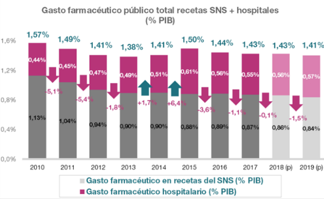 Efectivamente, el gasto farmacéutico total (incluyendo oficinas de farmacia y hospitales), que se situó en 16.619 millones de euros en 2017, supone hoy un 1,43% del PIB, frente al 1,57% del año 2010. Sólo en lo que se refiere a las oficinas de farmacia, la factura de 2017 asciende a 10.171 millones de euros, un nivel de gasto equivalente al que soportaba el SNS en abril de 2006.