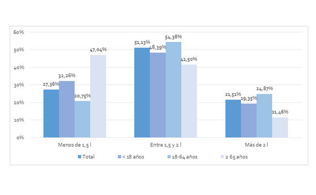 Una vez concluida la campaña sanitaria “Cinco Claves en Hidratación” y analizados los resultados de las encuestas realizadas durante la misma, se ha detectado que el 27,3 por ciento de los encuestados consumían menos de 1,5 litros de líquidos al día, lo que representa una cantidad inferior a las recomendaciones establecidas. Un porcentaje de usuarios que aumenta de forma significativa en el grupo de edad de mayores de 65 años, en donde hasta el 47% de los encuestados no llegaban al consumo recomendado de 1,5 litros de líquidos diarios.
