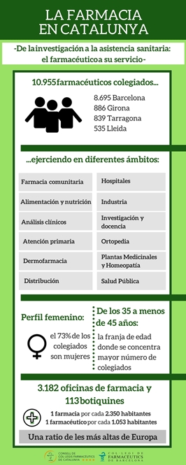 Todo esto es posible gracias a los más de 8.600 farmacéuticos de Barcelona que trabajan desde los diferentes ámbitos de ejercicio de la profesión -5.470 en las más de 2.300 farmacias de la provincia, 51 en investigación y docencia, 71 en salud pública, 289 en hospitales, 106 en la distribución y 194 en análisis clínicos, entre otros- para mejorar la salud y el bienestar de las personas.