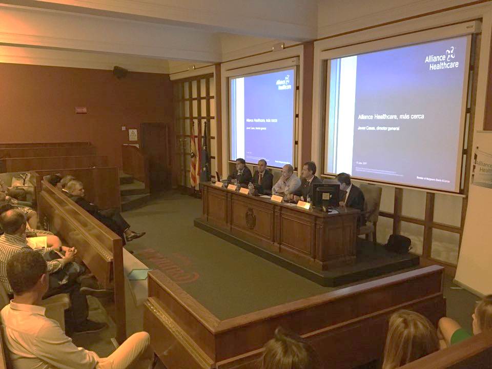 El encuentro tuvo lugar en la Cámara de Comercio e Industria de Zaragoza y contó con la presencia de César Martínez, presidente de Alliance Healthcare, Javier Casas, director general de la compañía, Ramón Jordán, presidente del Colegio Oficial de Farmacéuticos de Zaragoza, y Francisco Javier Ruiz Poza, presidente de la Federación Empresarial de Farmacéuticos Españoles de Aragón, entre otros.