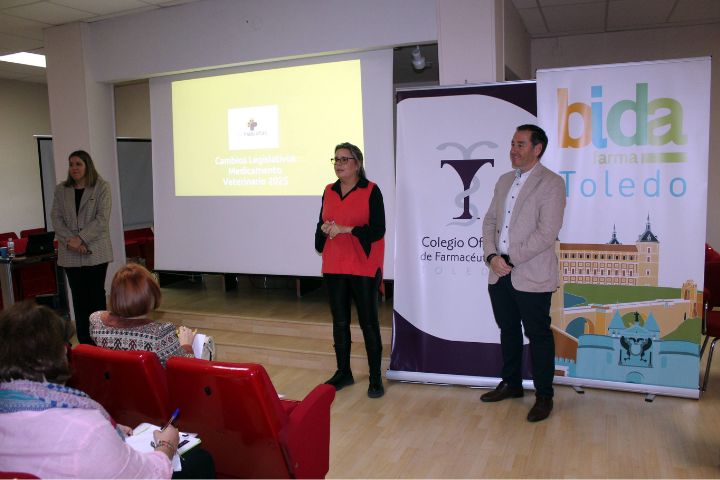 La ponente de la charla ha sido Pilar Fernández Rasco, veterinaria y responsable de Farmascotas en Bidafarma, a quien presentaron los vocales de Oficina de Farmacia y Distribución del COF de Toledo, respectivamente, María Victoria del Vigo y Fernando Soto.