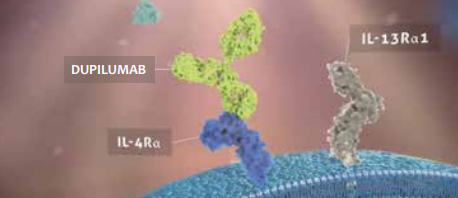 Dupixent® es un anticuerpo monoclonal humano elaborado específicamente para inhibir la hiperactividad de la señalización de dos proteínas clave, la IL-4 y la IL-13, que se consideran los principales inductores de la inflamación crónica subyacente presente en la DA y en otras enfermedades alérgicas o atópicas. Este tratamiento viene en una jeringuilla precargada y puede autoadministrarse como una inyección subcutánea cada dos semanas después de la dosis de carga inicial. Se puede utilizar en combinación con corticoesteroides tópicos o sin ellos.