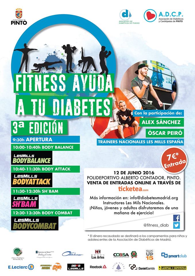 La Asociación de Diabéticos de Madrid y el Ayuntamiento de Pinto organizan junto con el propulsor de esta iniciativa, el reconocido monitor de deporte Pablo Guedes, la tercera edición de ‘Fitness ayuda a tu diabetes’. Se celebrará el 12 de Junio, a partir de las 10:00 y hasta las 14:00, en el polideportivo Alberto Contador, ubicado en la calle Isabel La Católica, s/n, de Pinto, Madrid.