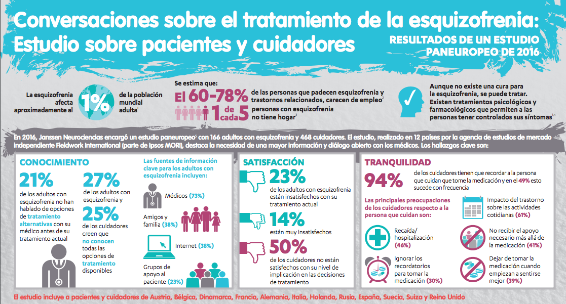 Janssen ha anunciado los resultados de un estudio paneuropeo: ‘Conversaciones sobre el tratamiento de la esquizofrenia: estudio sobre pacientes y cuidadores’. El estudio de 166 adultos con esquizofrenia y 468 cuidadores fue realizado por la agencia de estudios de mercado independiente, Fieldwork International (parte de Ipsos MORI) y en él se investigó el conocimiento, la implicación emocional y las preferencias relacionadas con el tratamiento.