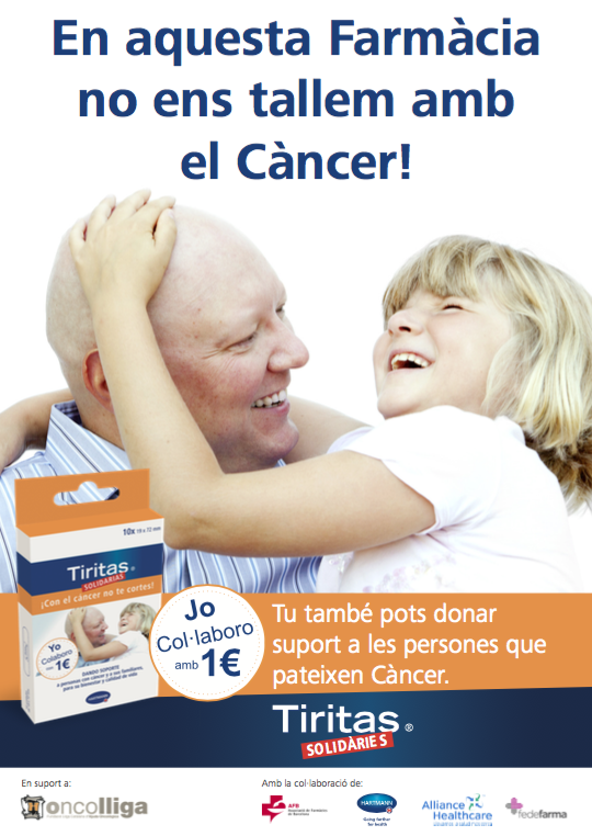 La cooperativa ha iniciado este abril una nueva colaboración con Hartmann para la distribución y venta de las Tiritas Solidarias contra el Cáncer a través de farmacias de Barcelona asociadas a Fedefarma. La iniciativa, presentada con el lema “amb el Càncer, no et tallis!” pretende recaudar fondos para destinarlos al Servicio de Atención Domiciliaria Integral de Oncolliga, una fundación que tiene por objeto brindar una atención psico-social a cualquier persona diagnosticada de alguna enfermedad oncológica y a su familia durante todo el proceso.